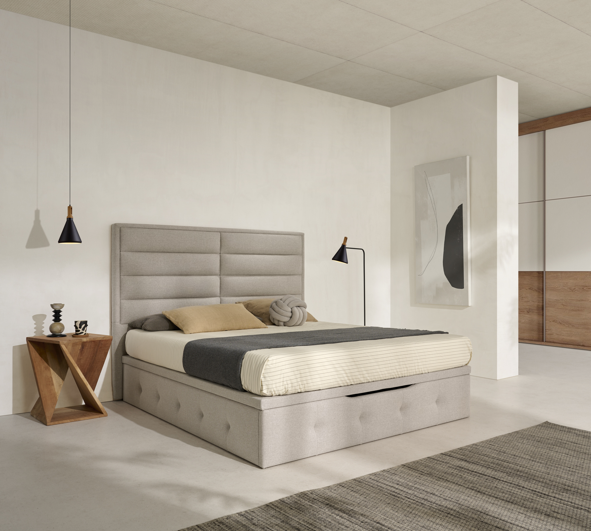 Opciones disponibles : Apertura lateral, tapa partida, tapa TOP, somier tapizado, bisagra doble pistón, patas metálicas, apertura motorizada, guardapolvo, con ruedas y cubrebisagras.