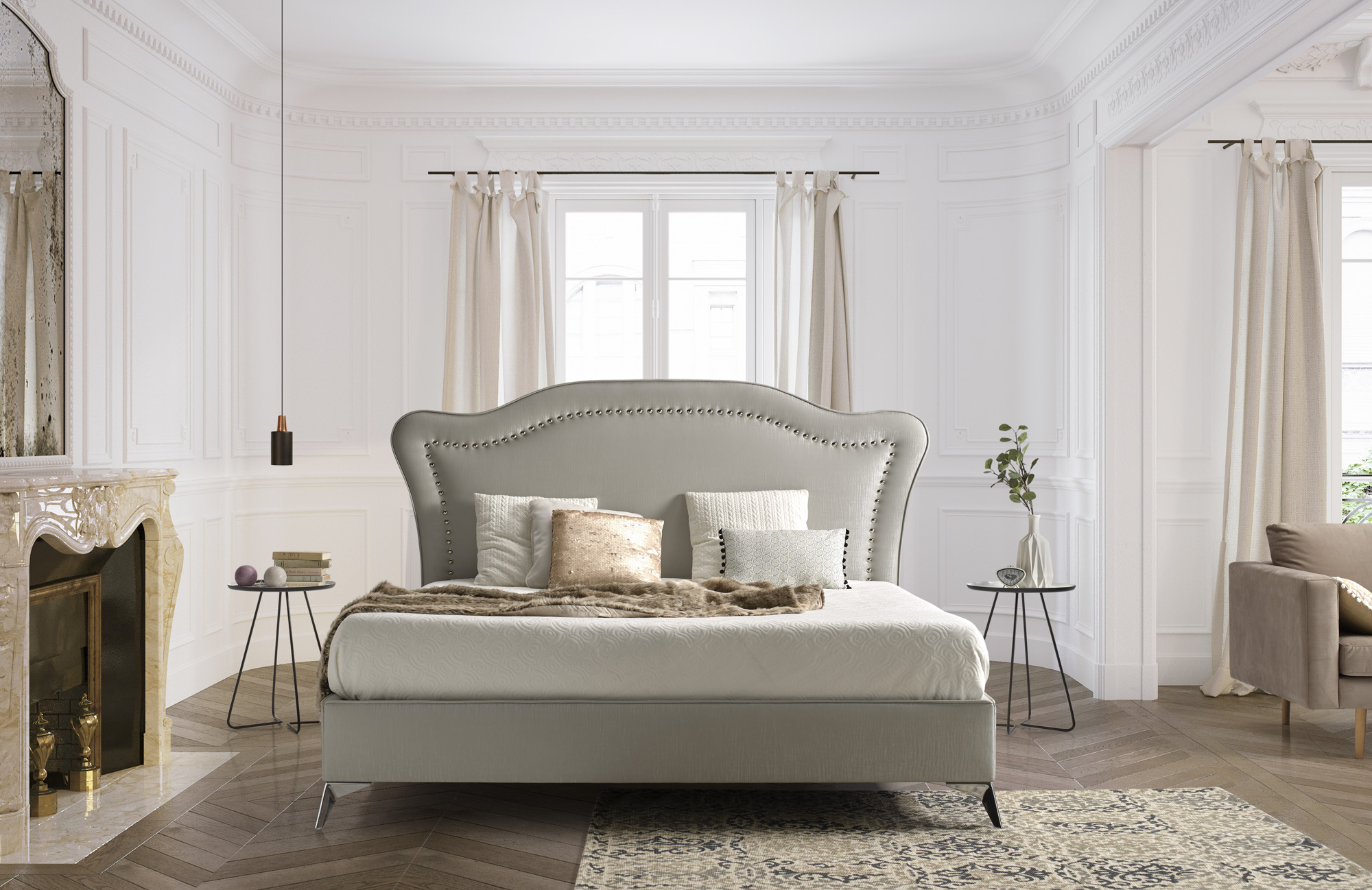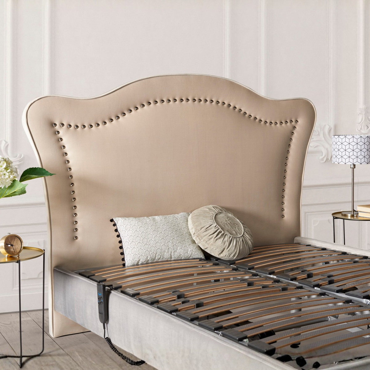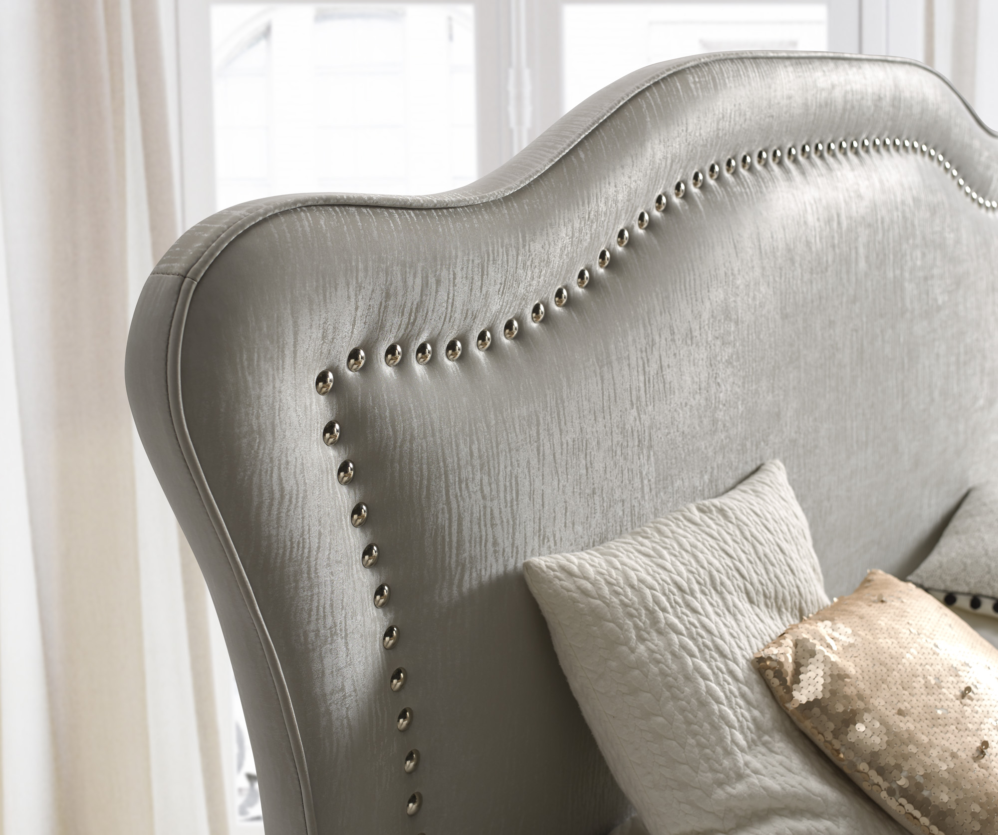 Cabecero tapizado CON TACHUELAS CROMO PLATA DE SERIE Y BORDON PERIMETRAL.