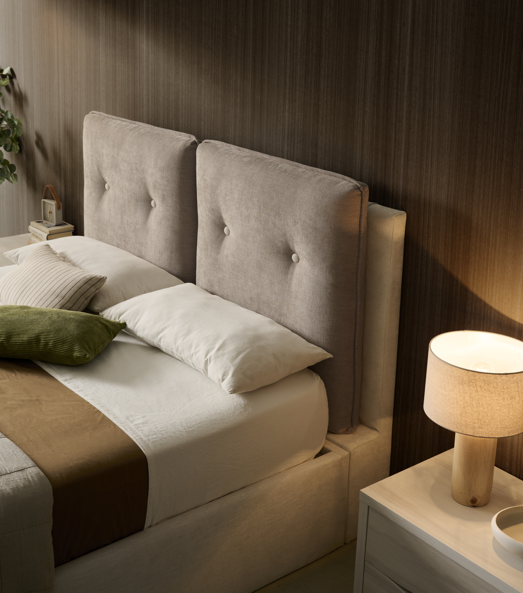 Cabecero tapizado CON BOTONES TAPIZADOS Y PESTAÑA PERIMETRAL EN ALMOHADAS. RECLINABLE.