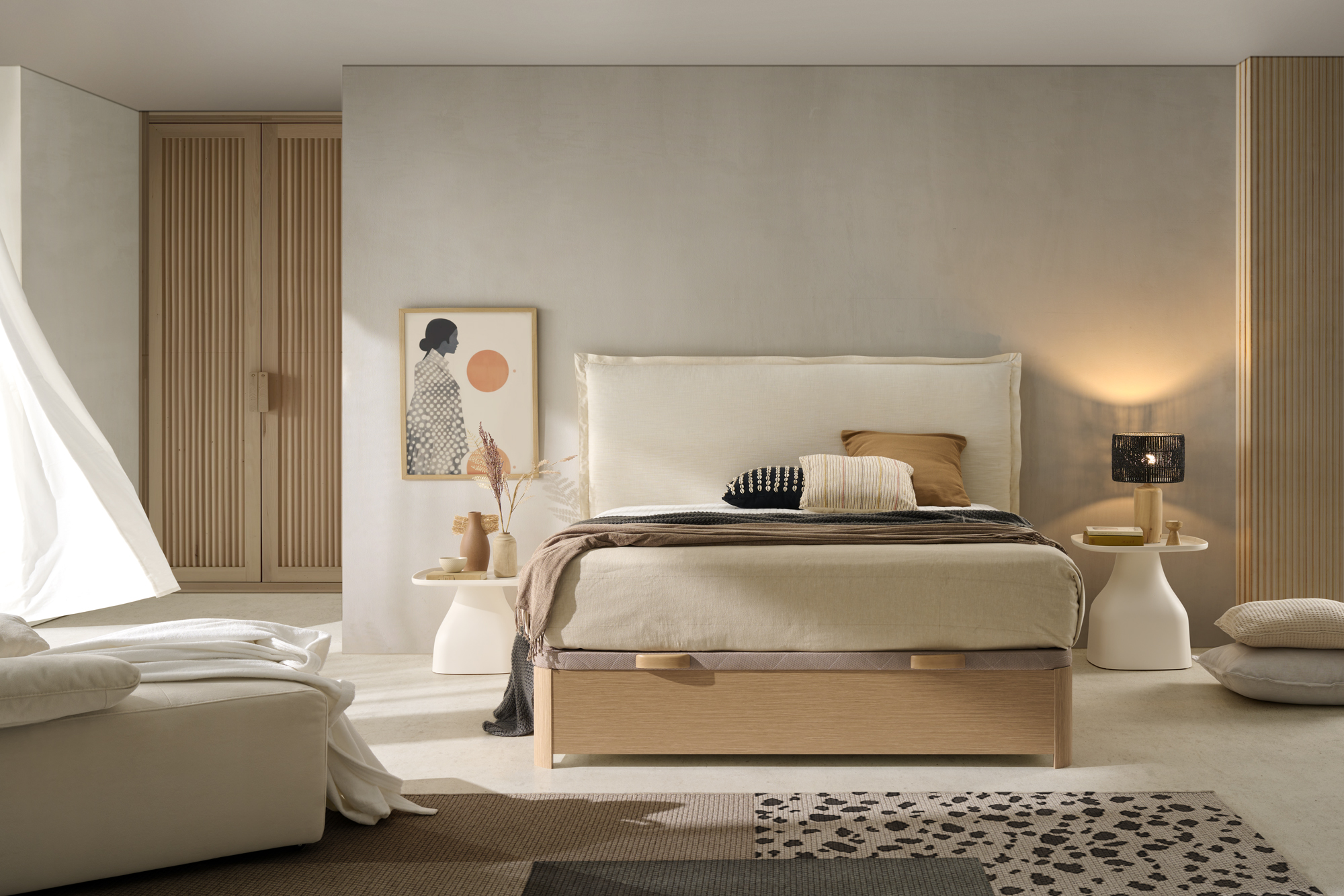 Opciones disponibles : Apertura lateral, tapa partida, tapa TOP, somier tapizado, somier tapizado activo, tirador KUI o SLIM, doble pistón, a suelo, ruedas, zócalo y cubrebisagras.